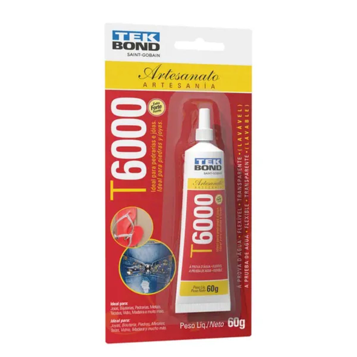 A Cola T6000 Tekbond 60g é um adesivo de alta performance, desenvolvido para quem precisa de uma colagem forte, durável e totalmente transparente após a secagem. Sua fórmula à base de solvente garante excelente aderência em diversos materiais, sendo ideal para artesanato, pedrarias, tecidos, couro, plásticos, borracha, metal, vidro, cerâmica, papel e muito mais.